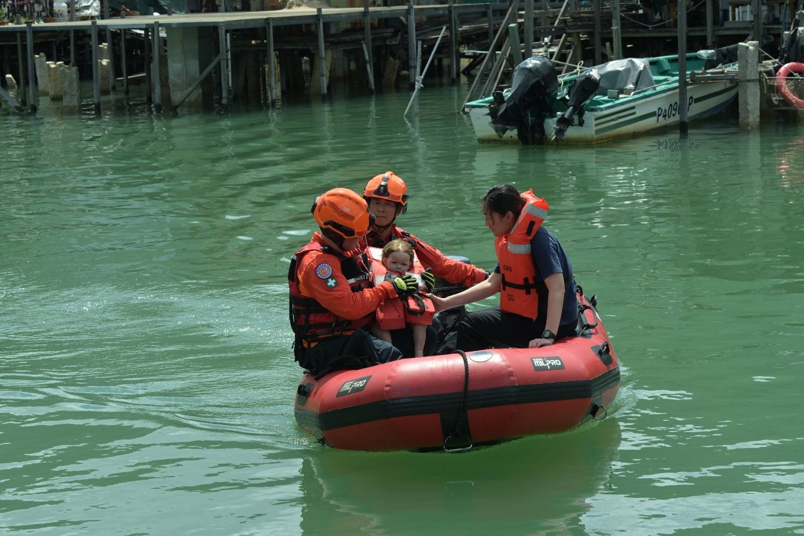 是次演練模擬有居民被洪水圍困,需要由救援人員進(jìn)行救援和疏散。民安隊隊員以橡皮艇拯救被困的居民,並協(xié)助他們安全撤離。(記者 區(qū)天海)