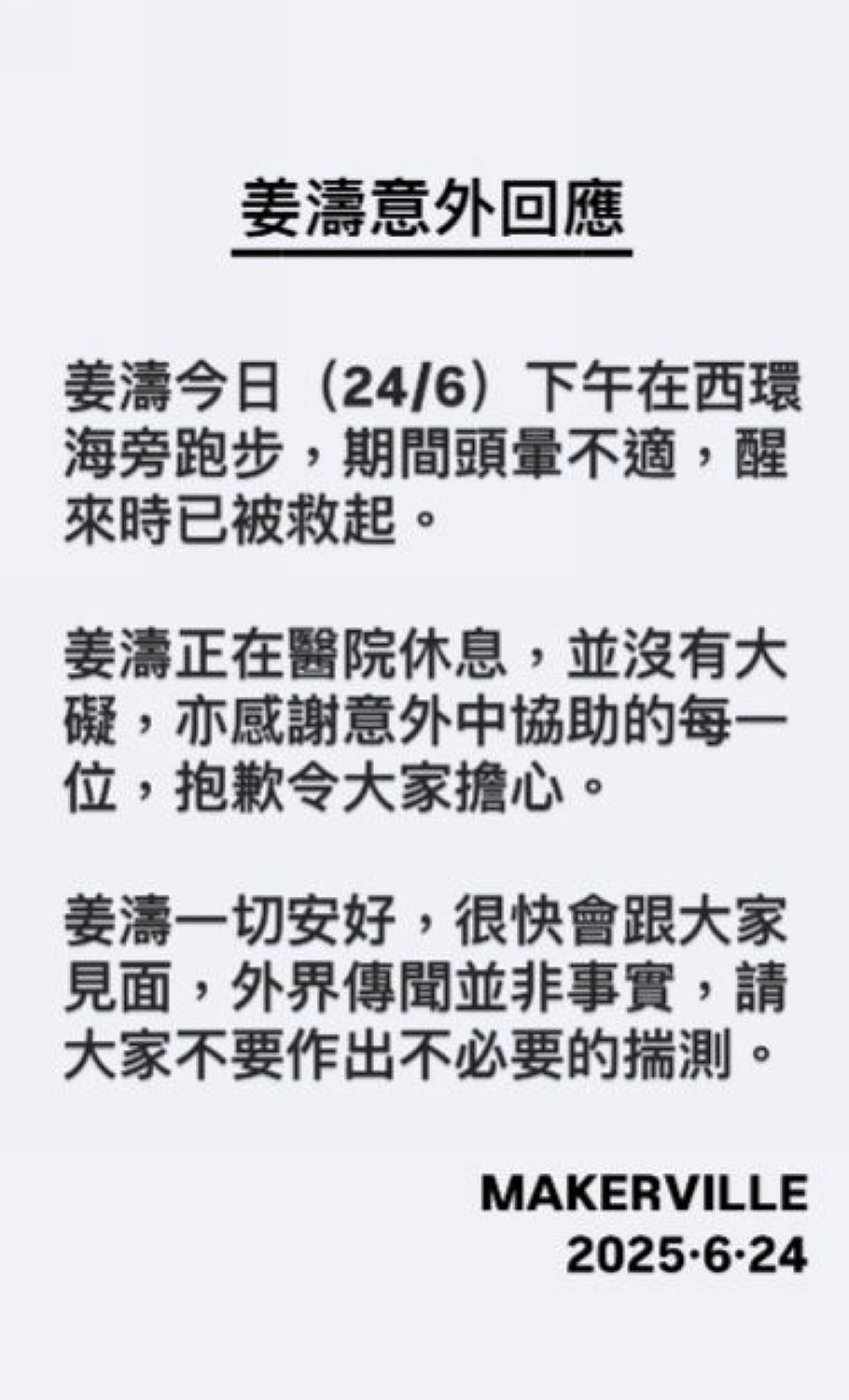 網(wǎng)上流傳懷疑是姜濤獲救後躺在船上的照片。姜濤在事發(fā)後在社交平臺(tái)上載豎起拇指的圖片,籲各界不用擔(dān)心。其經(jīng)理人在社交平臺(tái)引述姜濤稱,他在西環(huán)海旁跑步期間頭暈不適,不小心發(fā)生發(fā)生意外,現(xiàn)在已無礙,目前在醫(yī)院休息,一切安好,希望公眾不要作任何揣測(cè),並就事件引起外界擔(dān)心致歉。(記者 區(qū)天海)
