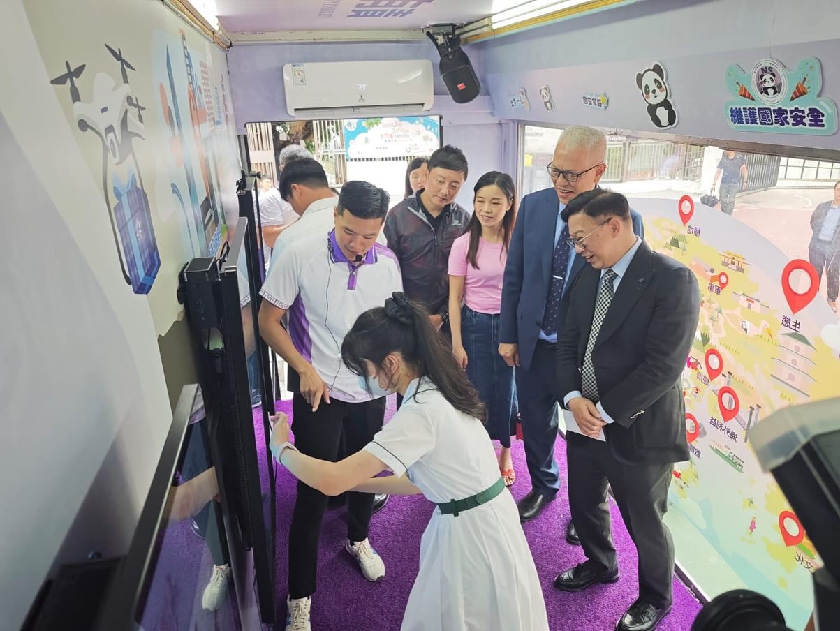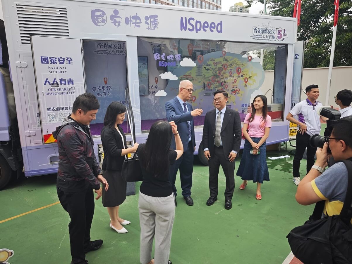 國(guó)安快遞宣傳車日前到香港基督教信義會(huì)信義中學(xué),向?qū)W生傳遞國(guó)家安全的資訊。律政司副司長(zhǎng)張國(guó)鈞及油尖旺撲滅罪行會(huì)委員勞佩儀和朱文彥親臨與各位師生一同參與「國(guó)安快遞NSpeed」宣傳車活動(dòng),透過(guò)互動(dòng)遊戲,加深學(xué)生對(duì)香港國(guó)安法、維護(hù)國(guó)家安全條例及總體國(guó)家安全觀20個(gè)重點(diǎn)領(lǐng)域的認(rèn)識(shí)。