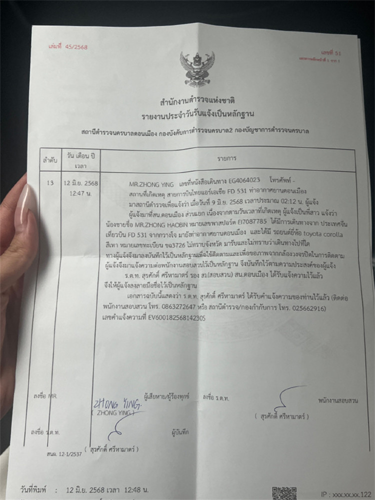 一名衷姓女士在微博發(fā)文稱(chēng),其弟弟衷浩彬從事模特工作已經(jīng)四年半,因接到雜誌封面拍攝邀請(qǐng), 6月8日晚上12點(diǎn)33分在廣州白雲(yún)機(jī)場(chǎng)乘坐飛機(jī)FD531到泰國(guó)廊曼機(jī)場(chǎng),2025年6月9日凌晨2點(diǎn)12到達(dá)泰國(guó)廊曼機(jī)場(chǎng)。凌晨3點(diǎn)15分,他在泰國(guó)廊曼機(jī)場(chǎng)6號(hào)門(mén)坐上了一輛車(chē)牌號(hào): ??3726 ????????的Toyota私家車(chē),被帶到泰國(guó)達(dá)府後失聯(lián),原本預(yù)訂的酒店(B Your Home Hotel Donmueang Airport Bangkok)也並未入住。