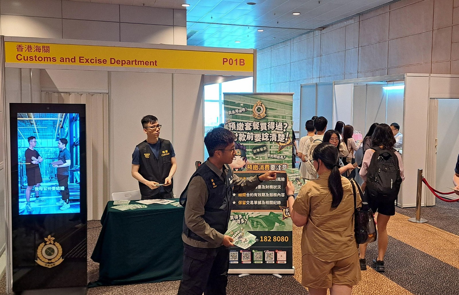 海關(guān)宣傳隊(duì)人員於7月11至13日,到會(huì)展中心「香港婚紗展暨世界結(jié)婚巡禮2025、香港婚宴展暨結(jié)婚用品博覽2025」,向市民派發(fā)宣傳單張,提醒消費(fèi)者購買預(yù)繳套餐時(shí)要小心謹(jǐn)慎。