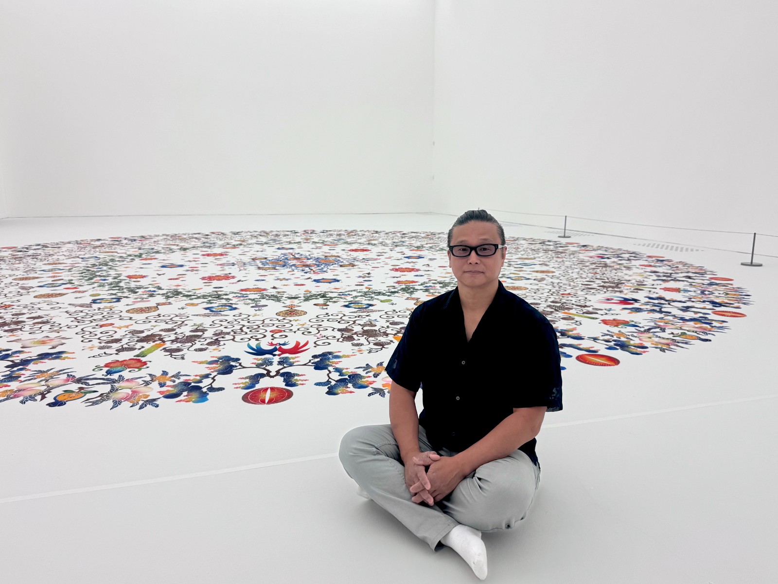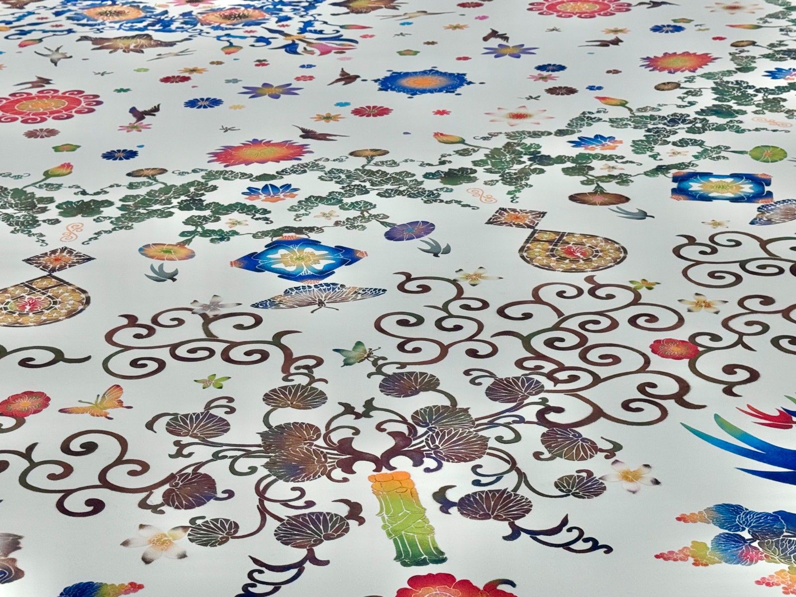 進(jìn)入展廳便能看到藝術(shù)家未完成的巨型作品「光之合奏」,這是持續(xù)進(jìn)?的「迴響無限」系列創(chuàng)作之?。該作品由無數(shù)獨(dú)特的花鳥、蝴蝶,以及象徵性的圖案組成,以彩色礦物質(zhì)粉末堆疊,顏色絢麗多彩。?巻伸嗣在接受香港商報(bào)記者專訪時(shí)表示:「我熱愛烹飪,過去常常接觸各種粉狀材料。那段經(jīng)歷刻在記憶裏,讓我萌生了用粉末作畫的念頭。」他指出,人們作畫通常追求留下永久的痕跡,但粉末畫的美恰恰在於它的短暫易逝。這種轉(zhuǎn)瞬即逝之美令他深深著迷:「我家鄉(xiāng)常下小雪,雪勢不大,零星雪花飄落,在地面淺淺鋪就一層。我格外喜愛那種能看見它留下的痕跡,能捕捉到痕跡的殘餘,隨後又目睹它悄然消逝的感覺。」在他看來,觀察材料自身變化的過程,本身就充滿美感,無比迷人。