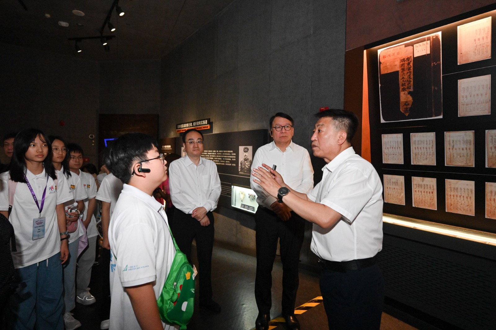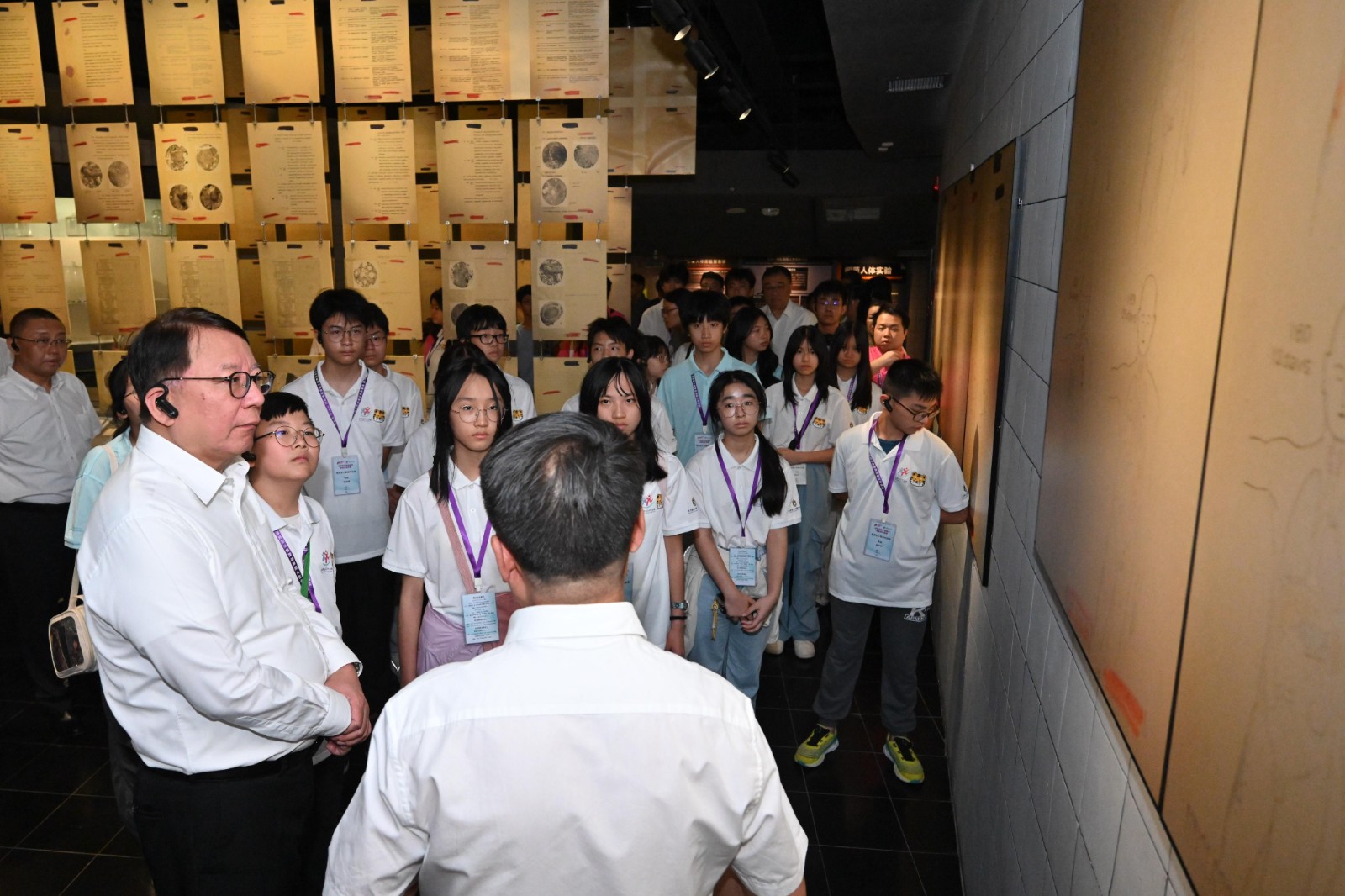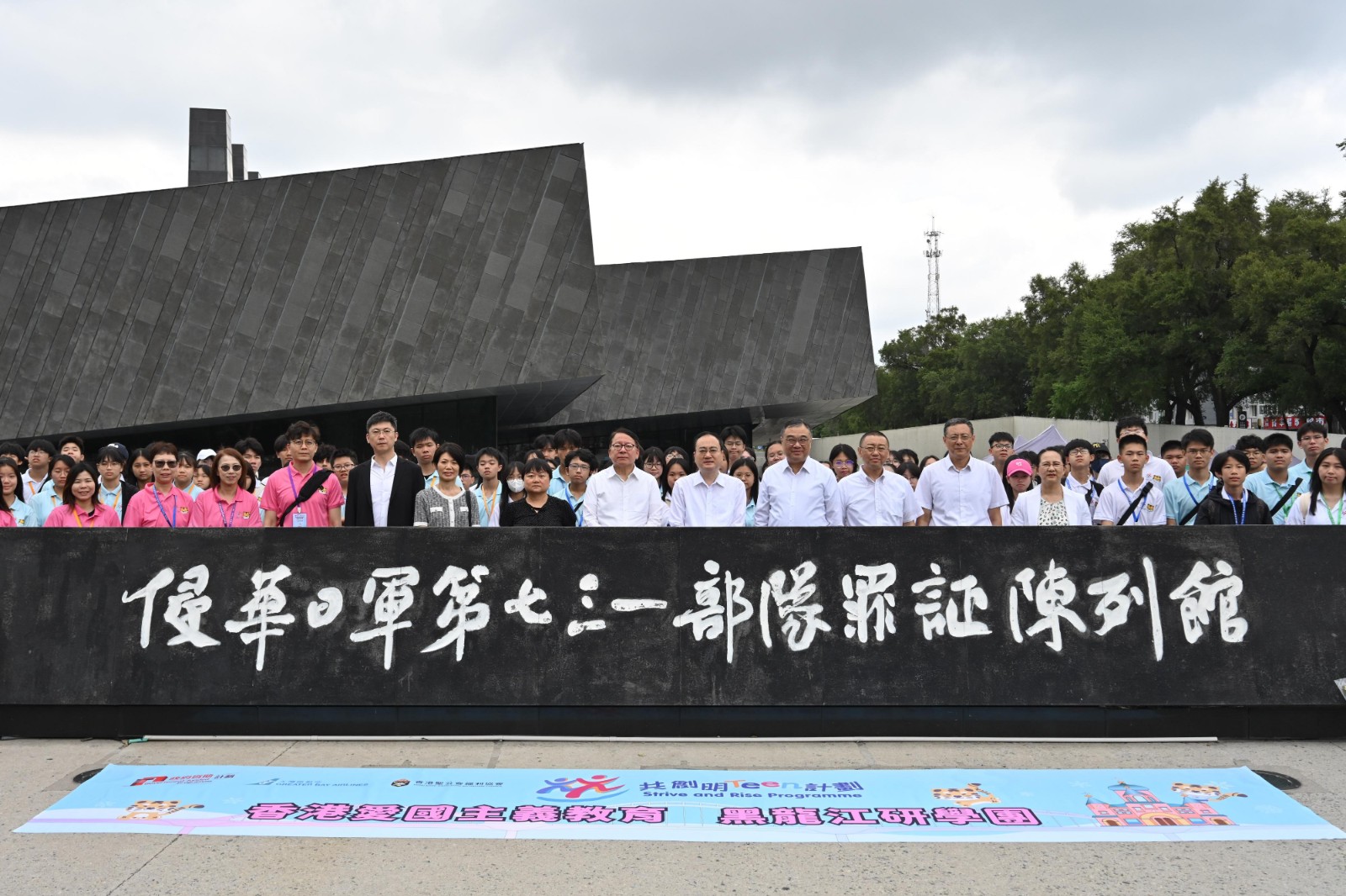 陳國基與「共創(chuàng)明『Teen』計劃」——香港愛國主義教育黑龍江研學(xué)團(tuán)團(tuán)員一同參觀侵華日軍第七三一部隊罪證陳列館,並聽取工作人員介紹。政府新聞處