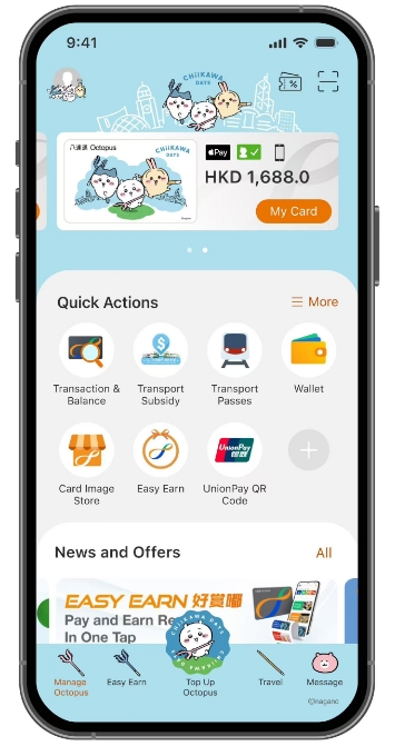 購買手機(jī)版八達(dá)通「CHIIKAWA DAYS」主題卡面後,CHIIKAWA會(huì)出現(xiàn)在八達(dá)通APP的啟動(dòng)畫面及主頁介面。(八達(dá)通圖片)