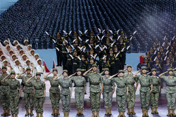隨後駐香港部隊(duì)官兵為現(xiàn)場(chǎng)來賓獻(xiàn)上了精心創(chuàng)排的文藝演出。演出以兵唱兵、兵演兵的方式呈現(xiàn)火熱強(qiáng)軍實(shí)踐,表演唱《強(qiáng)軍有我》、《軍旗跟著黨旗走》,表達(dá)了駐軍官兵堅(jiān)決聽黨指揮、矢志奮鬥強(qiáng)軍的忠誠擔(dān)當(dāng);歌曲聯(lián)唱《礪兵香江》、《我為香港站崗》,反映了駐軍部隊(duì)紮實(shí)練兵備戰(zhàn)、忠實(shí)履行防務(wù)的戰(zhàn)鬥姿態(tài)和過硬能力;合唱《強(qiáng)軍戰(zhàn)歌》,以激越高昂的旋律將演出氣氛推向高潮,展現(xiàn)了廣大官兵聚力攻堅(jiān)、奮進(jìn)一流的信心決心。在全場(chǎng)人員合唱《歌唱祖國》的熱烈氛圍中,招待會(huì)圓滿結(jié)束。整個(gè)活動(dòng)簡(jiǎn)約樸素、軍味戰(zhàn)味濃郁,進(jìn)一步凝聚了愛祖國、愛香港、愛駐軍的強(qiáng)大正能量。