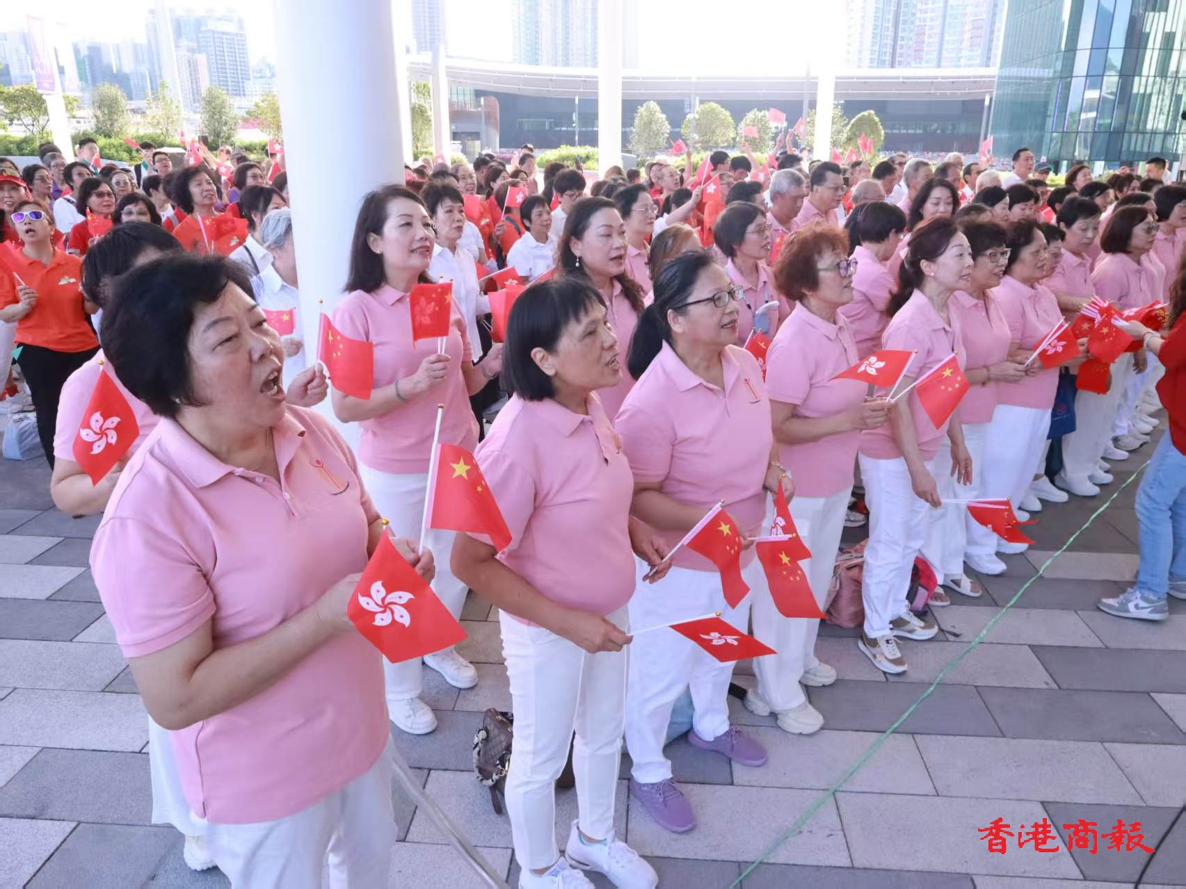 香港愛樂樂團合唱團與超過十支,包括主協(xié)辦單位的少兒和成人合唱團數(shù)百人,一起合唱《獅子山下》和《東方之珠》;最後由樂團演奏、參與者齊唱《歌唱祖國》,在雄壯的歌聲中於啟德體育園中央廣場展示十米乘八米巨型國旗。
