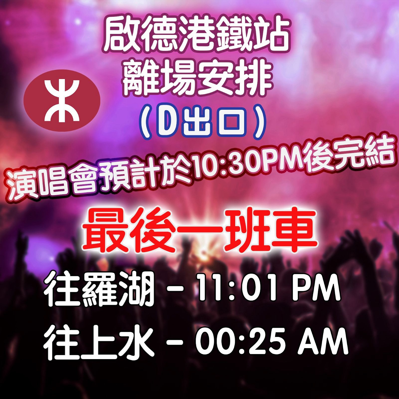 演唱會(huì)預(yù)計(jì)在晚上10時(shí)30分結(jié)束,觀眾如選擇欣賞演唱會(huì)直至完場(chǎng),有可能會(huì)錯(cuò)過(guò)在宋皇臺(tái)站及啟德站開(kāi)往羅湖的尾班列車,可選擇乘坐港鐵往上水或巴士SP12前往新田。(記者 區(qū)天海)