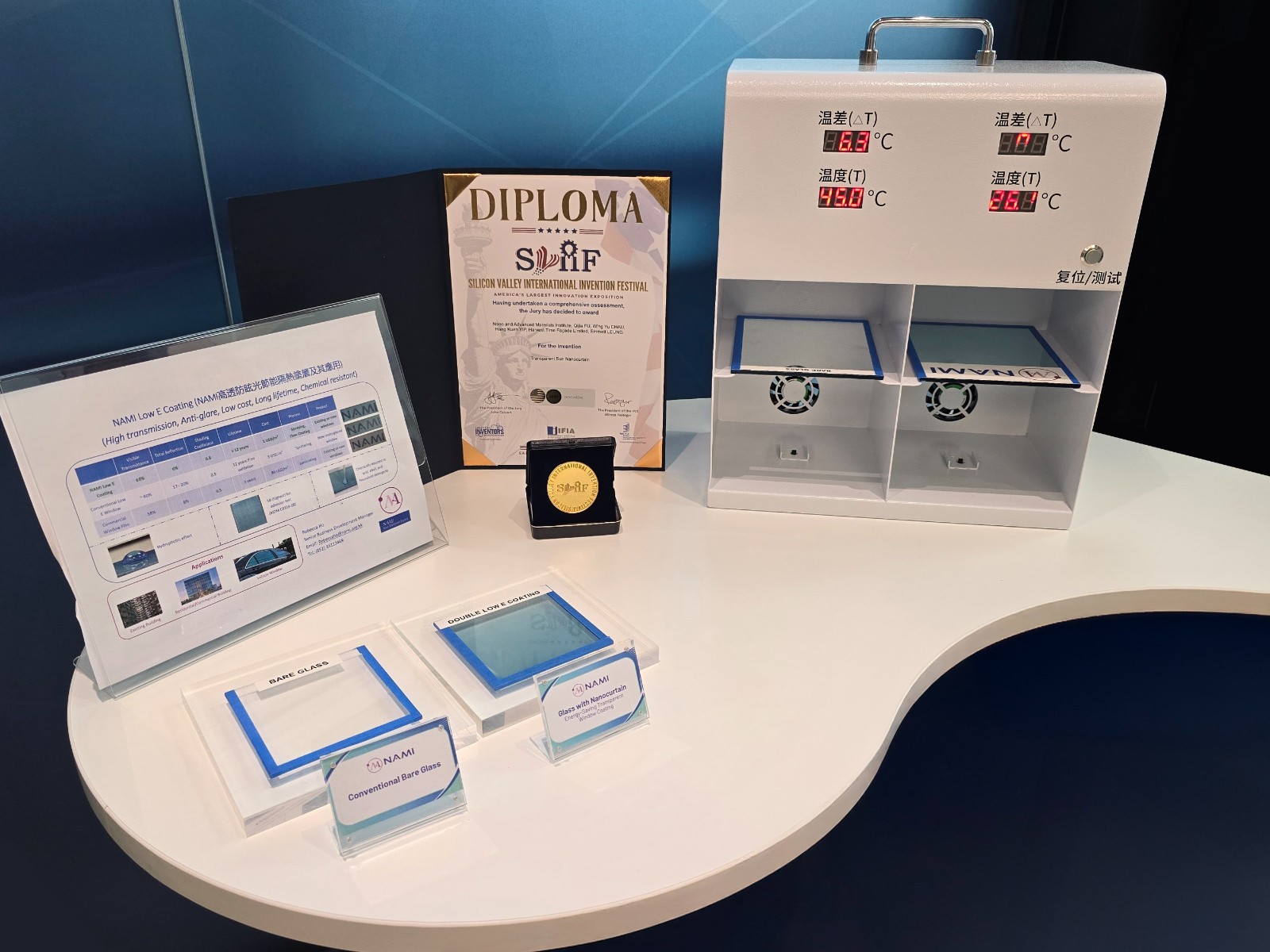 在標(biāo)注透明透光納米窗簾的展臺(tái)前,項(xiàng)目負(fù)責(zé)人保時(shí)幕牆有限公司副項(xiàng)目總監(jiān)鄒啟榮先生介紹到,此納米塗層可應(yīng)用於各類(lèi)窗戶,特別是舊樓,具備阻擋50%太陽(yáng)能量、超過(guò)60%可見(jiàn)光穿透率及低於6%反射率的全球領(lǐng)先節(jié)能表現(xiàn),施工簡(jiǎn)便且成本低廉。該項(xiàng)目榮獲2025矽谷國(guó)際發(fā)明節(jié)金獎(jiǎng)、2025愛(ài)迪生獎(jiǎng)金獎(jiǎng)以及2024全球百大科技研發(fā)獎(jiǎng)。