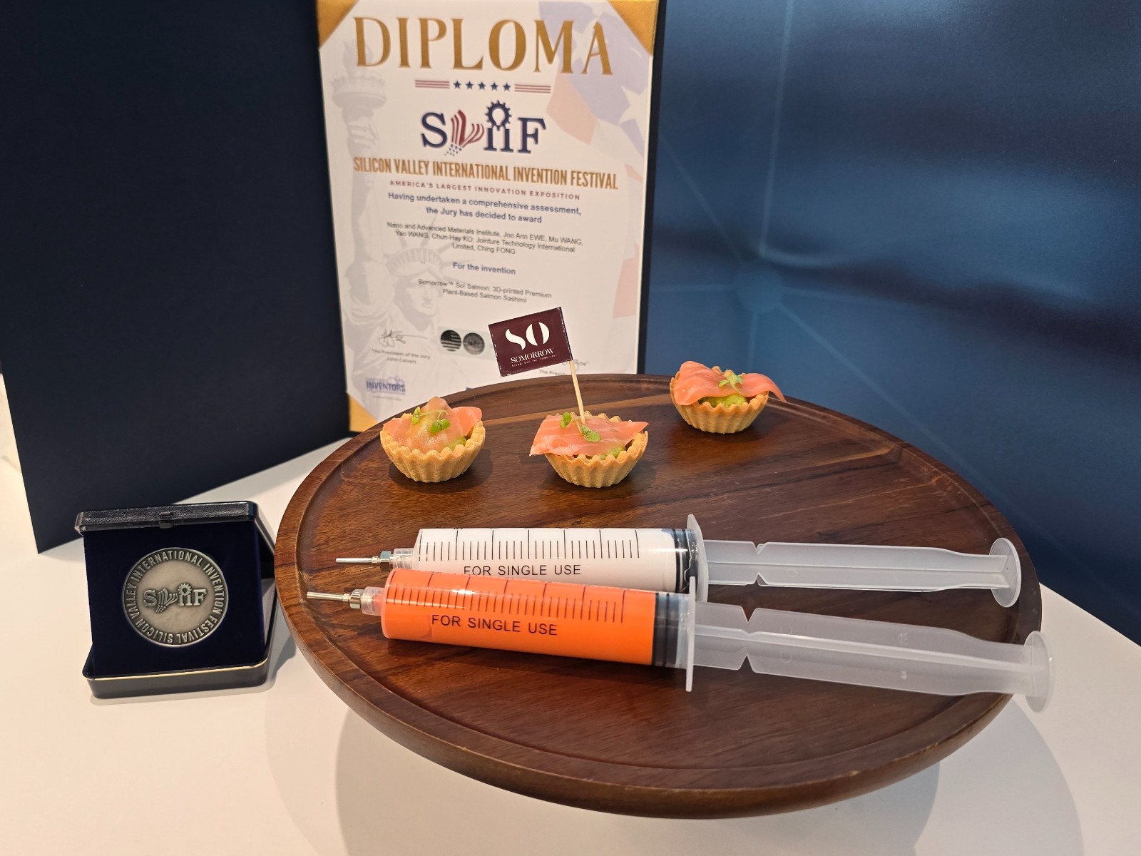 隨後,記者在另一側(cè)展臺(tái)前看到與大家熟知的三文魚(yú)片幾乎沒(méi)有區(qū)別的3D打印高級(jí)純素生三文魚(yú)片。匯川科技國(guó)際有限公司總監(jiān)方政先生向記者介紹,Somorrow?是以3D打印及納米雙凝膠技術(shù)製作的刺身級(jí)純素三文魚(yú)片,其外觀與口感逼真,無(wú)需烹調(diào),營(yíng)養(yǎng)豐富,並有助保護(hù)海洋生態(tài),推動(dòng)本港可持續(xù)飲食文化。該項(xiàng)目榮獲2025日內(nèi)瓦國(guó)際發(fā)明展評(píng)判特別嘉許金牌以及2025矽谷國(guó)際發(fā)明節(jié)銀獎(jiǎng)。