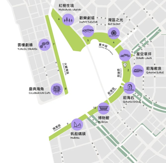 前海石公園群,圍繞「前海石」環(huán)灣一圈,分為桂灣段、前灣段、媽灣段、寶中段、大鏟灣段等。依託前海灣的濱海資源,12公里城市開放公園帶串聯(lián)起「環(huán)灣十景」,漫步其間,海風(fēng)拂面,可以享受到休閒、文化、景觀、藝術(shù)、生態(tài)等多元體驗。