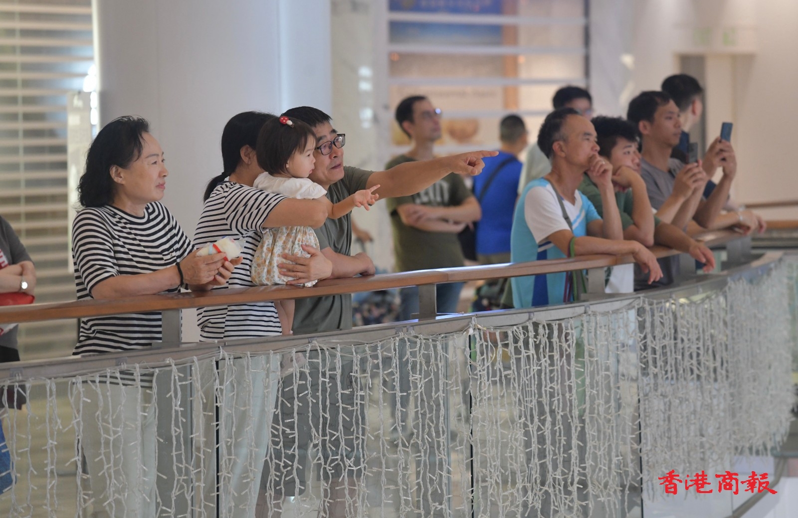紀(jì)念中國人民抗日戰(zhàn)爭暨世界反法西斯戰(zhàn)爭勝利80周年大會(huì)今日(3日)在北京天安門廣場隆重舉行。圖為香港市民在奧海城商場觀看九三盛大閱兵直播。(記者崔俊良攝)
