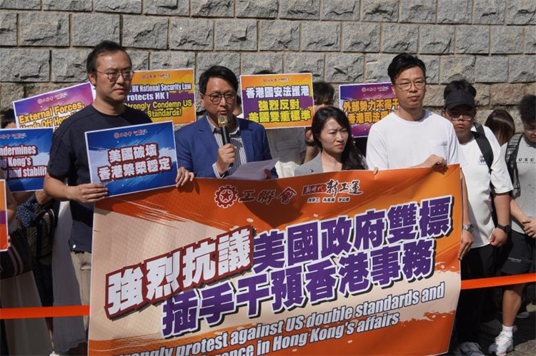 美國近期發(fā)布所謂「香港政策法報(bào)告」,對(duì)香港事務(wù)的粗暴干預(yù),引起各界不滿。工聯(lián)會(huì)及一批市民今日(5日)到美國駐港澳領(lǐng)事館請(qǐng)願(yuàn),就美國近期一系列粗暴干預(yù)香港事務(wù)的行為表示強(qiáng)烈抗議和堅(jiān)決反對(duì)。