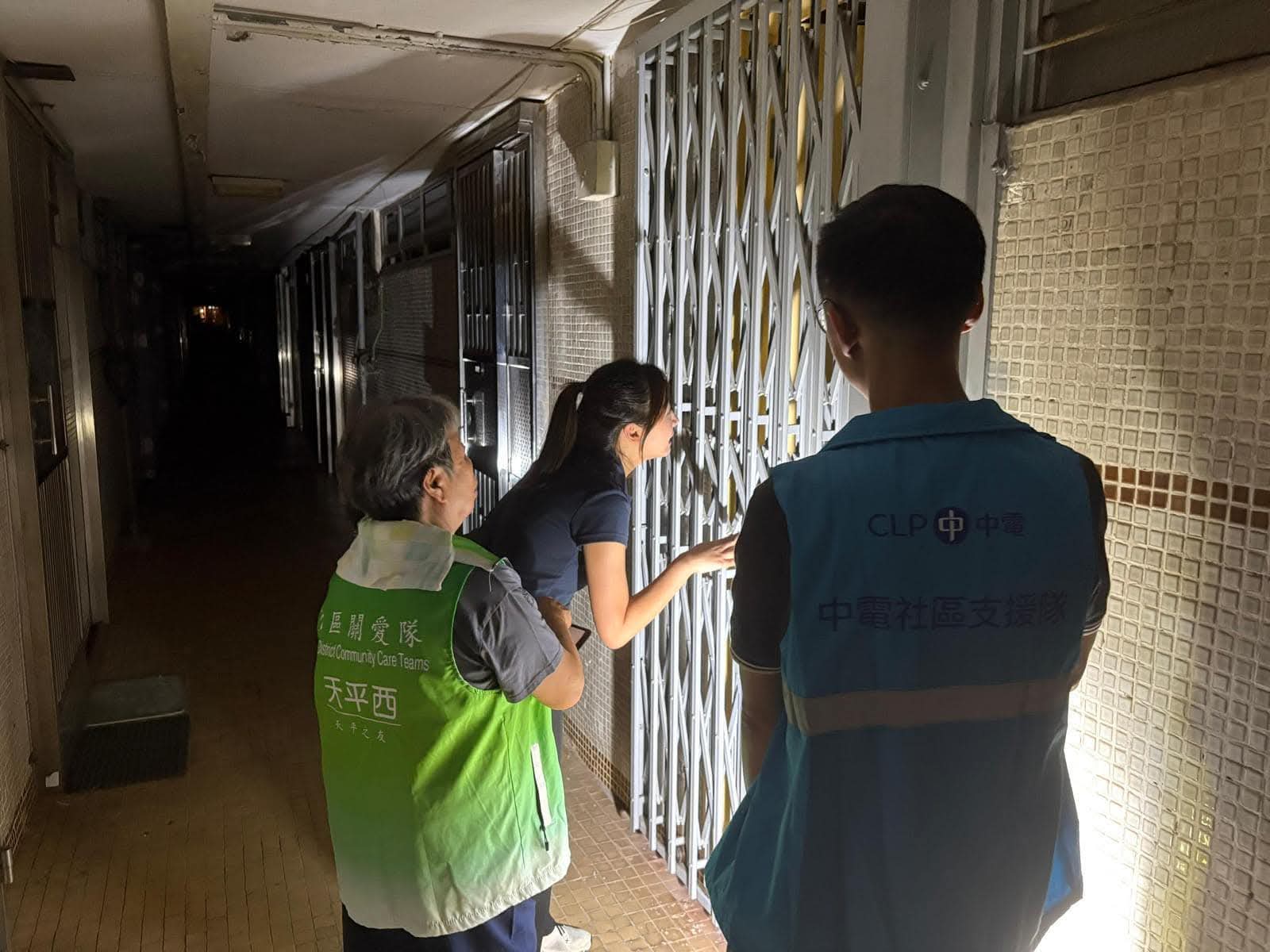 上水天平邨天明樓停電,北區(qū)民政處、區(qū)議員、關(guān)愛隊及政府部門全力支援居民。 民政事務(wù)總署供圖