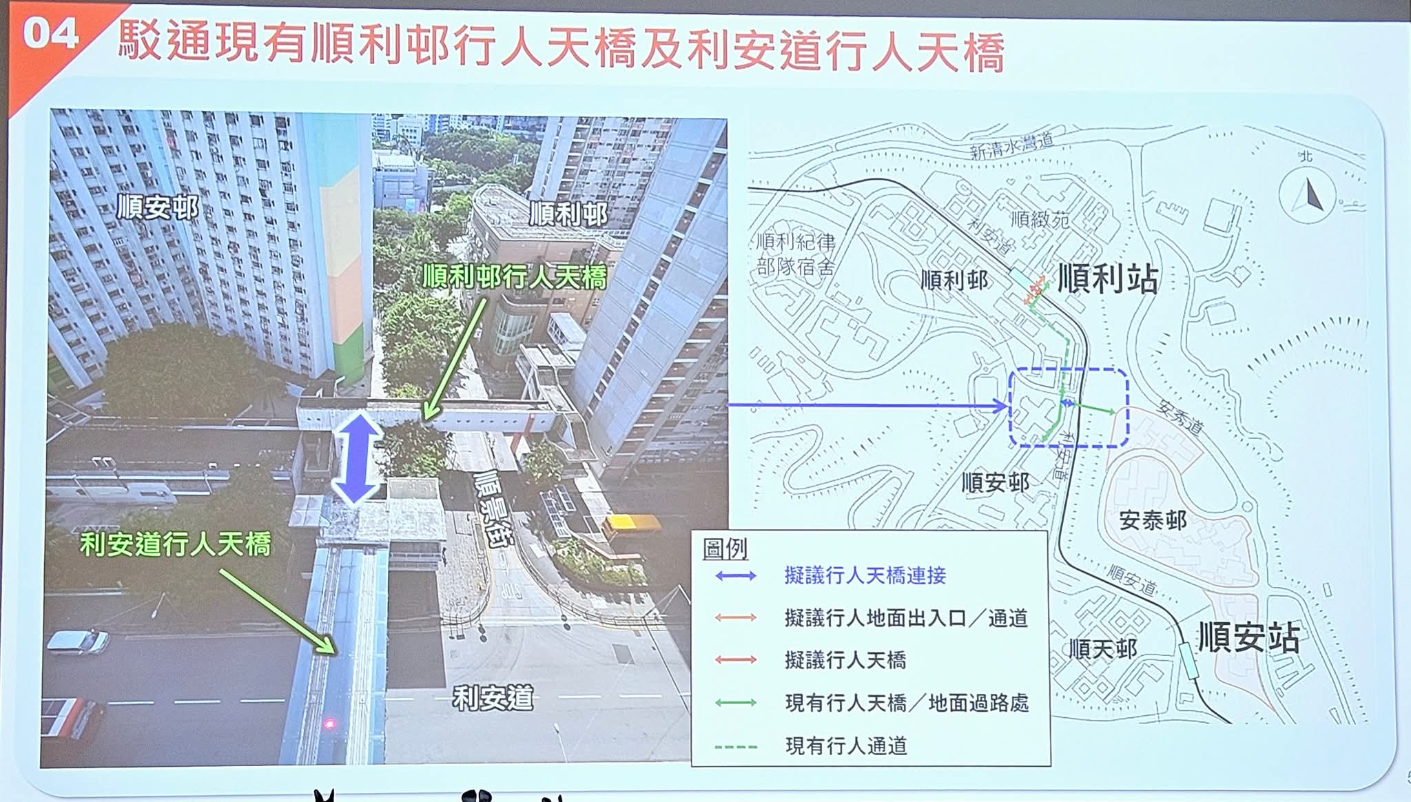 此外,顏汶羽感謝路政署回應(yīng)地區(qū)聲音,優(yōu)化幾個車站的優(yōu)化行人接駁網(wǎng)絡(luò),一是接納民建聯(lián)對優(yōu)化順利站行人接駁設(shè)施的建議,將現(xiàn)時安泰邨往返順安邨的行人天橋與順利邨與順安邨的行人天橋接駁起來,讓順安邨及安泰邨居民可以有全段有上蓋的行人通道,目標(biāo)在2029-2030年動工。