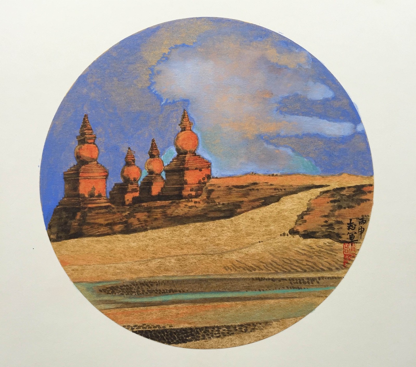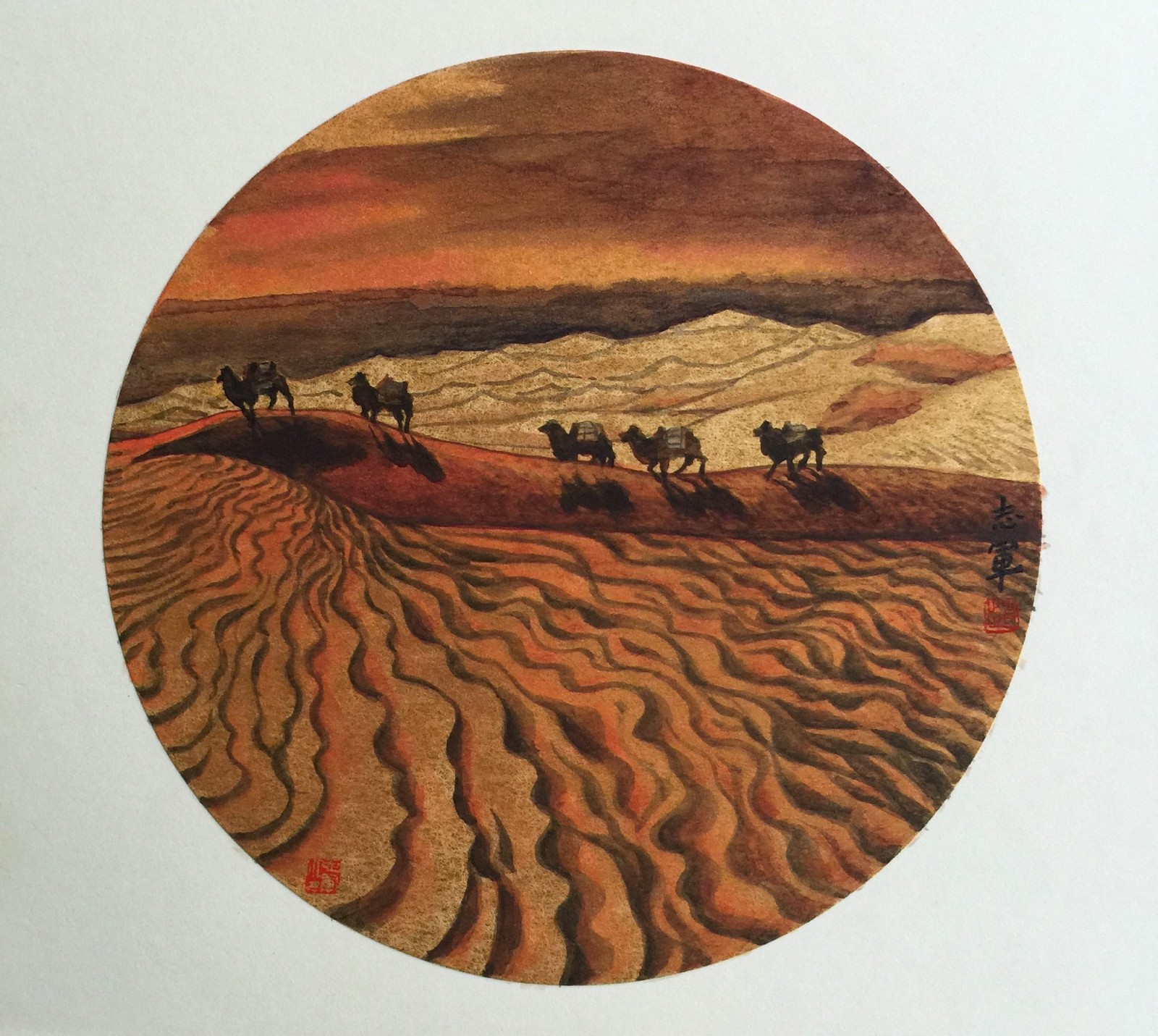 《大漠晚霞》 38cm*38cm 水墨設(shè)色 作品創(chuàng)作者:趙志軍(字之境、號大郡)。