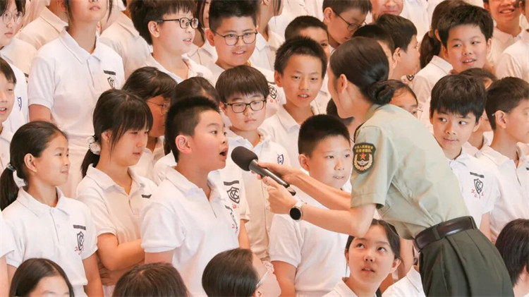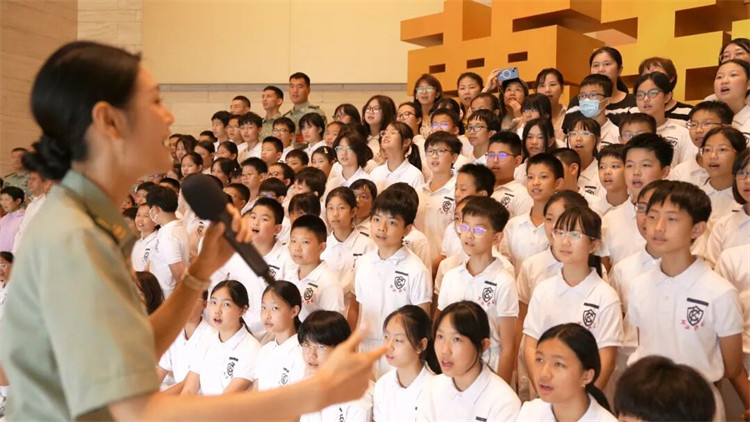 在駐香港部隊展覽中心廣場,駐軍官兵、東江縱隊港九大隊抗戰(zhàn)老戰(zhàn)士後人和香港蘇浙小學師生們整齊列隊,共同舉行升國旗儀式。伴隨著激昂的《義勇軍進行曲》,鮮艷的五星紅旗冉冉升起,全體人員面向國旗高唱國歌,歌聲迴蕩在維多利亞港上空。