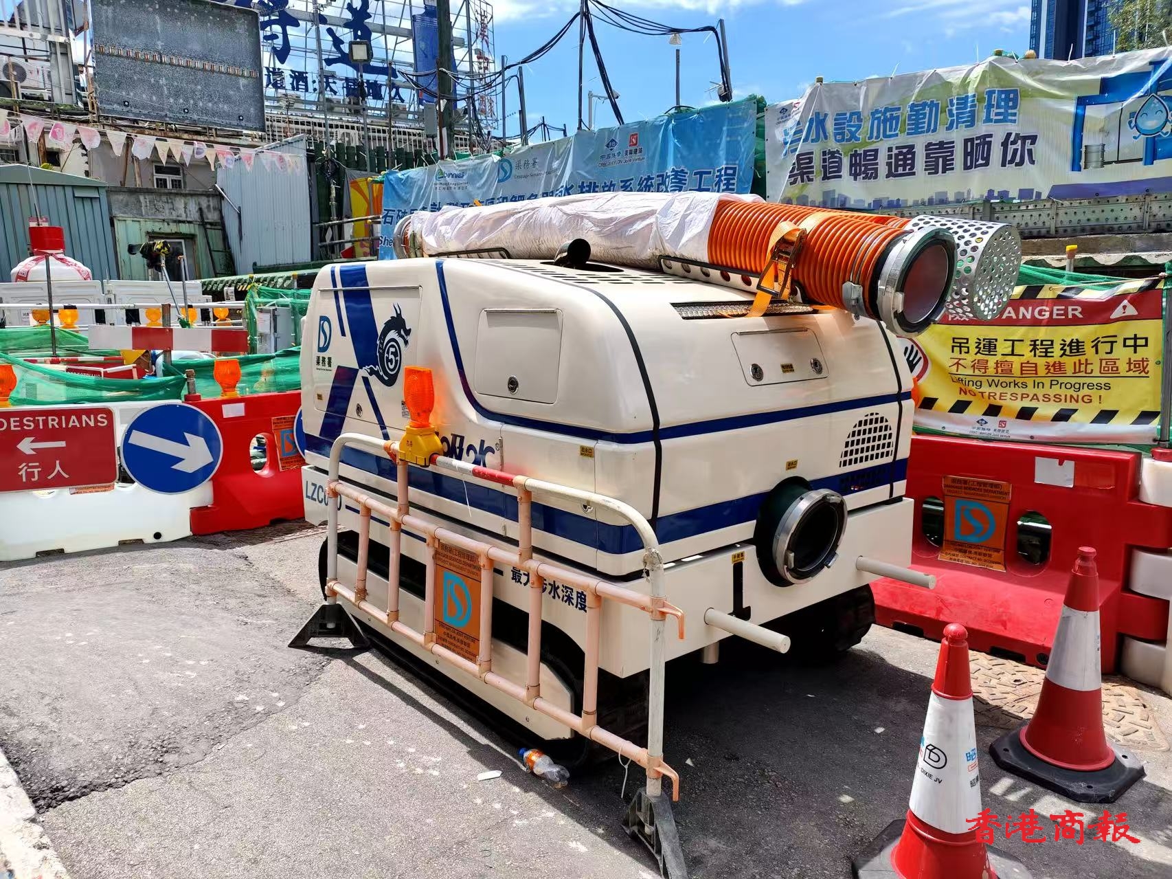 現(xiàn)場(chǎng)放置「龍吸水」機(jī)械人侯命應(yīng)對(duì)水浸。記者 馮瀚文攝