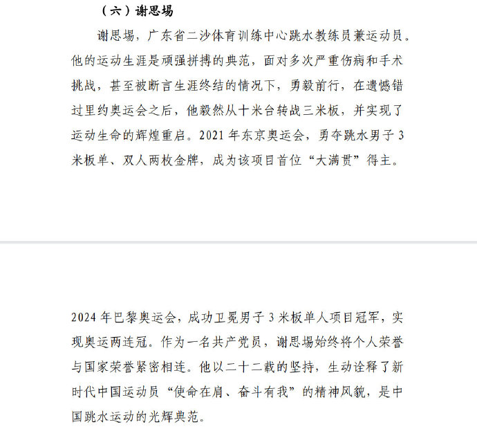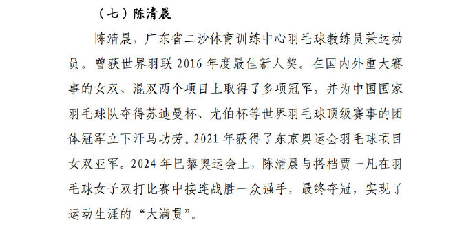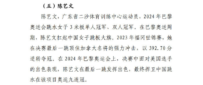 9月30日,廣東省體育局官網(wǎng)公示全國體育系統(tǒng)先進(jìn)個人擬推薦名單,13名運動員入選,包括全紅嬋、陳藝文、謝思埸、梁偉鏗、王柳懿、王芊懿、王欣瑜等。