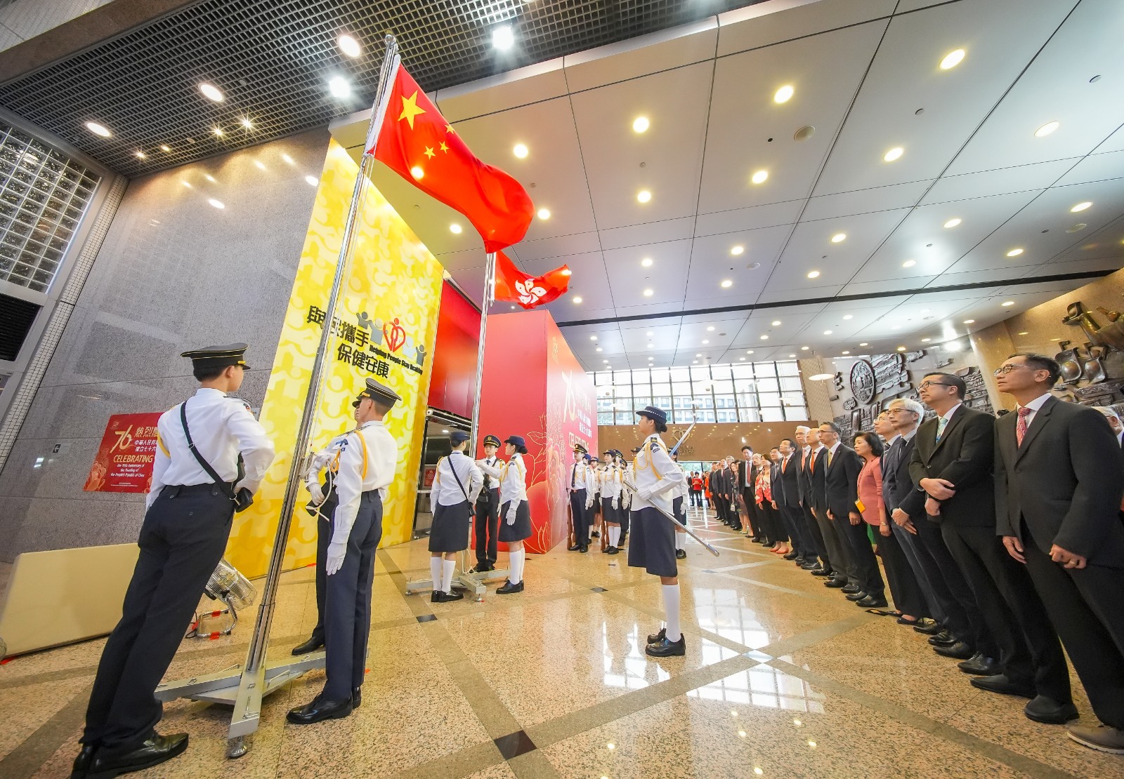 醫(yī)院管理局(醫(yī)管局)今日(10月1日)10時(shí)30分在醫(yī)院管理局大樓舉行升旗儀式,慶祝中華人民共和國(guó)成立76周年。國(guó)旗和區(qū)旗在奏唱國(guó)歌聲中徐徐升起,與會(huì)者都祝願(yuàn)國(guó)家繁榮安定,國(guó)泰民安。