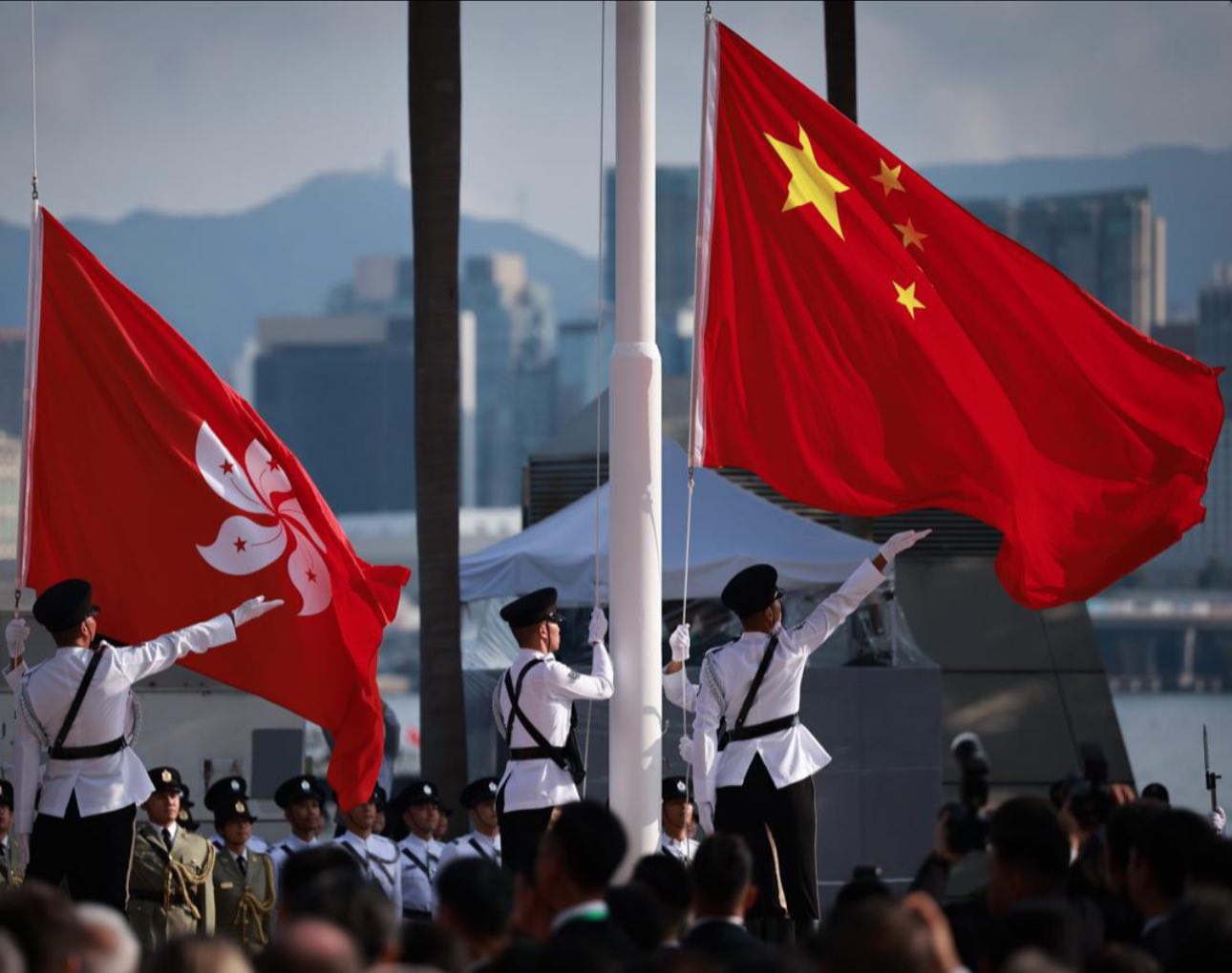 為慶祝中華人民共和國成立76周年,今日(1日)早上8時,特區(qū)政府在金紫荊廣場舉行升旗儀式。