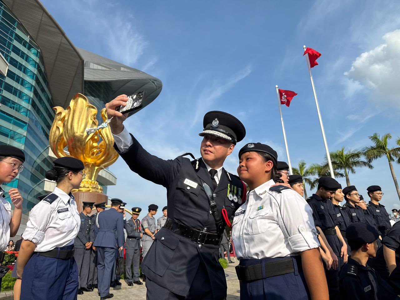 升旗儀式過後,護(hù)旗方隊步伐齊整離開會場。警務(wù)處處長周一鳴亦在場觀禮,並與少年制服團(tuán)隊隊員合照留念。(記者 區(qū)天海)