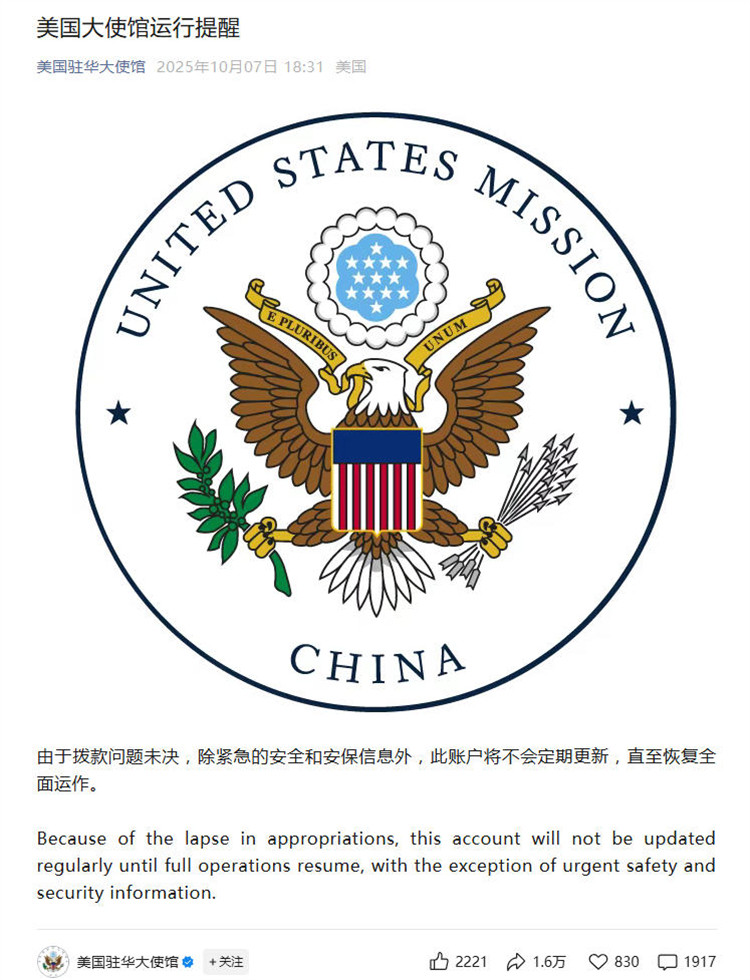 美國駐華大使館昨日下午(10月7日)表示,由於撥款問題未決,除緊急的安全和安保信息外,其網(wǎng)頁及微博、微信等賬戶將不會定期更新,直至恢復(fù)全面運(yùn)作。