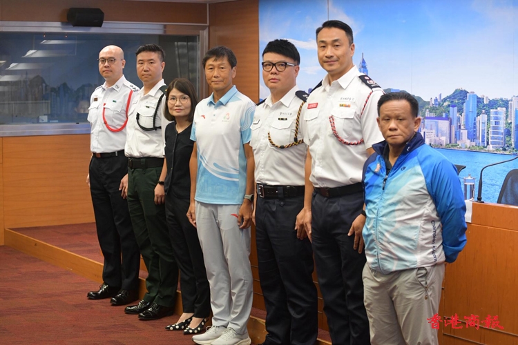 圖說:左起為入境處邊境管制(車輛)科指揮官黃君彥、香港海關(guān)跨境橋岸科總指揮官袁偉明、運(yùn)輸署首席運(yùn)輸主任/新界關(guān)國恩、全國運(yùn)動會香港賽區(qū)統(tǒng)籌辦公室主任楊德強(qiáng)、香港警務(wù)處新界南總區(qū)總部(行動)高級警司鄭威鍵、消防處高級消防區(qū)長(全國運(yùn)動會支援)郭威信和中國香港單車總會技術(shù)總監(jiān)黃志如合照。