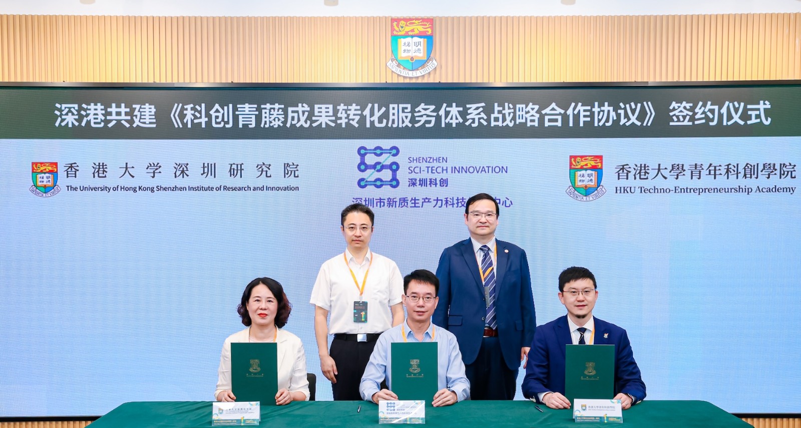 周年慶典上,深圳市新質(zhì)生產(chǎn)力科技促進(jìn)中心主任王輝介紹了「深圳科創(chuàng)青藤成果轉(zhuǎn)化服務(wù)體系」。該體系作為聚焦早期科創(chuàng)項(xiàng)目轉(zhuǎn)化的平臺(tái),通過人才、項(xiàng)目與資本的多輪互選機(jī)制,助力項(xiàng)目落地與資源對(duì)接。香港大學(xué)深圳研究院、香港大學(xué)青年科創(chuàng)學(xué)院與深圳市新質(zhì)生產(chǎn)力科技促進(jìn)中心共同簽署了戰(zhàn)略合作協(xié)議,未來將圍繞成果轉(zhuǎn)化體系共建、技術(shù)轉(zhuǎn)移推動(dòng)及科研設(shè)施共享等方面展開合作,共同促進(jìn)香港大學(xué)科研成果在大灣區(qū)的轉(zhuǎn)化與應(yīng)用。
