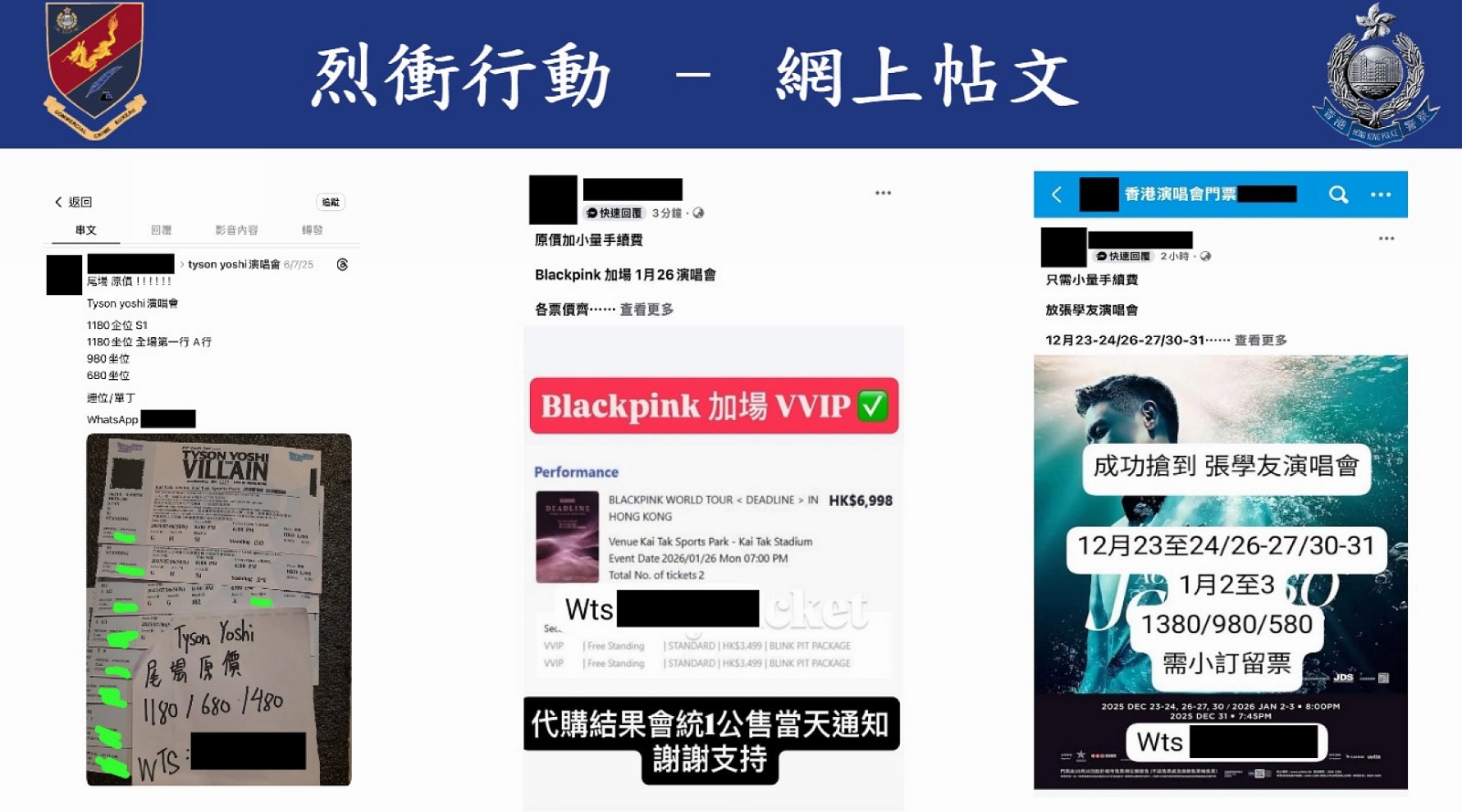 警方商業(yè)罪案調(diào)查科展開代號「烈衝」行動,搗破一個本地網(wǎng)上購票詐騙集團,相信活躍數(shù)月在網(wǎng)上出售黃牛飛或假門票,涉及多個大型演唱會和體育賽事,包括MAMA音樂頒獎禮、Tyson yoshi和張學(xué)友演唱會;昨日(20日)拘捕5名男女,涉及約200名受害人,損失金額約50萬元。