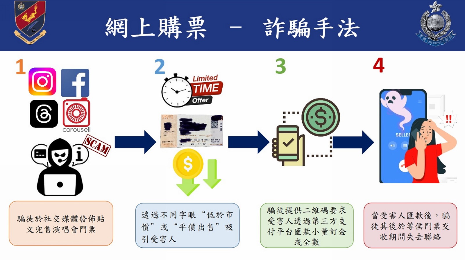 商業(yè)罪案調(diào)查科訛騙組總督察何潤賢今日(21日)表示,啟德體育園主場館啟用後吸引國際團體和表演單位來港舉辦大型盛事,多位國際級歌手和樂隊及知名球隊來港舉行活動。如剛過去暑假有數(shù)隊球隊來港,另外明年1月有一隊極受歡迎的外國女子組合再度來港開演唱會。在活動門票發(fā)售日期間,掀起搶購門票熱潮和炒風(fēng),騙徒亦趁機透過不同社交媒體,向球迷或歌迷在網(wǎng)上兜售高價黃牛飛,或訛稱可代購門票,甚至售賣假門票。