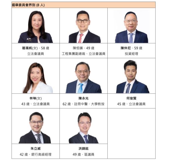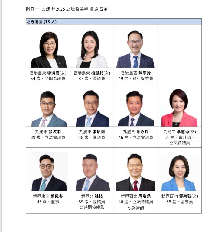 新選制後首次參選立法會的民建聯(lián)成員,包括競逐地區(qū)直選的李清霞、植潔鈴、張培剛、葉傲冬、姚銘、郭芙蓉、盧婉婷;選舉委員會界別的有朱立威、洪錦鉉;張琪騰競逐商界(第三)、陳博智競逐漁農(nóng)界。朱麗玲則再接再厲出選社福界。26位候選人平均年齡為47歲,當(dāng)中最年輕是郭芺蓉(35歲);女候選人共有8位。