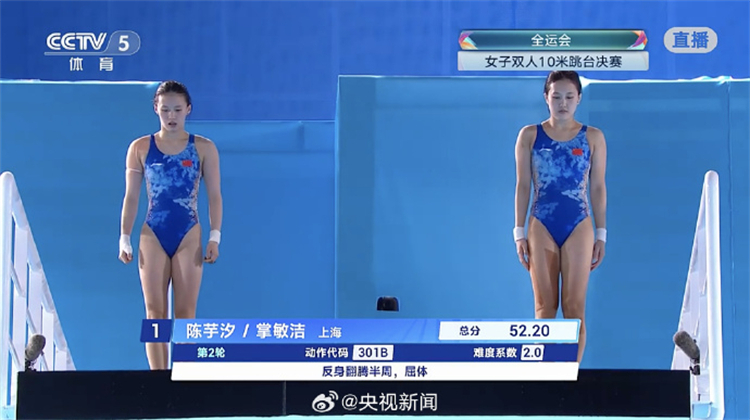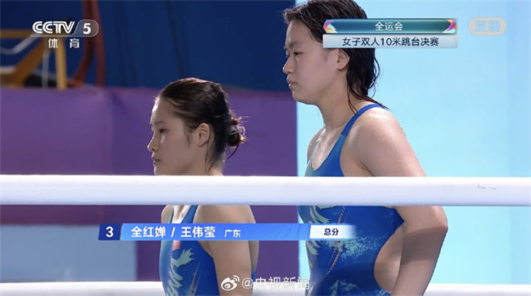 第十五屆全國(guó)運(yùn)動(dòng)會(huì)跳水項(xiàng)目女子雙人10米臺(tái)決賽6日晚在廣東奧林匹克體育中心舉行,最終,上海隊(duì)組合陳芋汐/掌敏潔以350.22分奪得金牌,四川隊(duì)組合李蕊汐/盧為以322.44分奪得銀牌,江蘇隊(duì)組合劉軍熙/孟澤瑞以316.44分摘銅。廣東隊(duì)組合全紅嬋/王偉瑩獲得第五名,成績(jī)?yōu)?11.76分。(圖片截自央視節(jié)目)