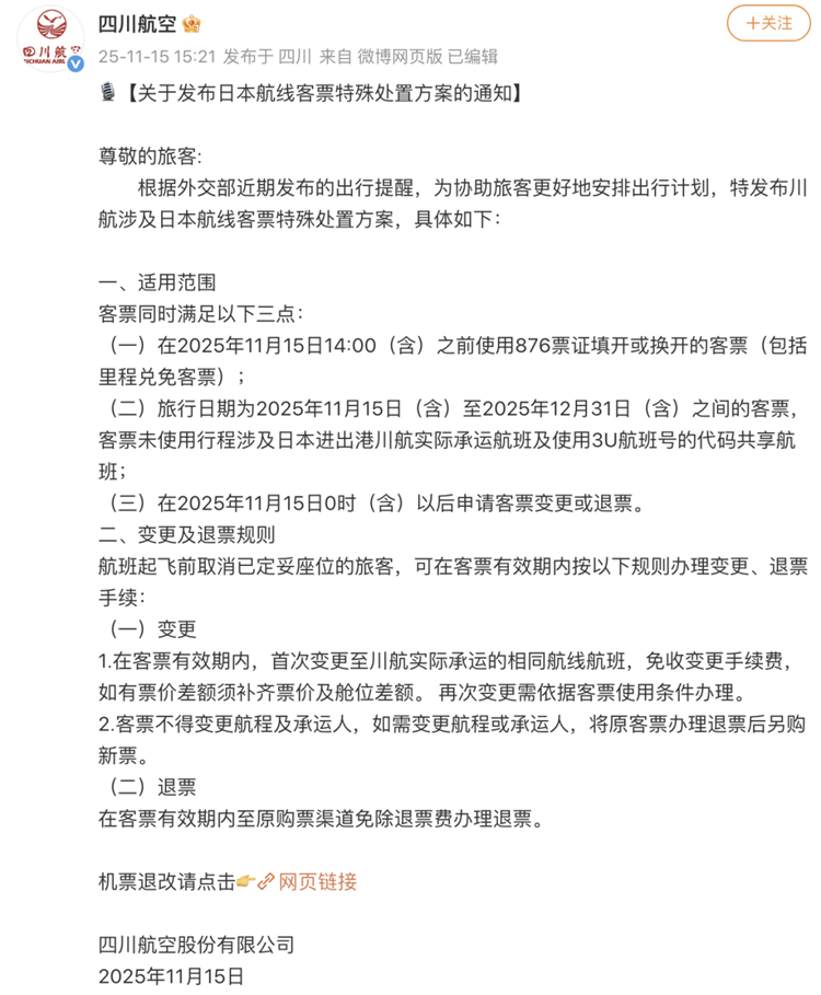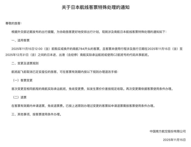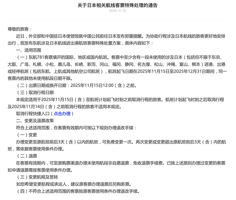 15日,國(guó)航、南航、東航、海航、川航、廈航等航司相繼發(fā)布通知,對(duì)於出行日期在12月31日之前,涉及日本相關(guān)航線且符合相關(guān)條件的客票,可予以免費(fèi)退改處理。